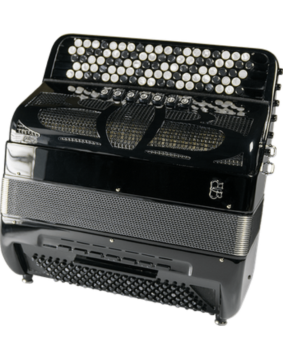 -Mão direita: 96 botões, 5 filas, 58 notas (la#/sol), 4 vozes, 7 registos, 8 registos de queixo