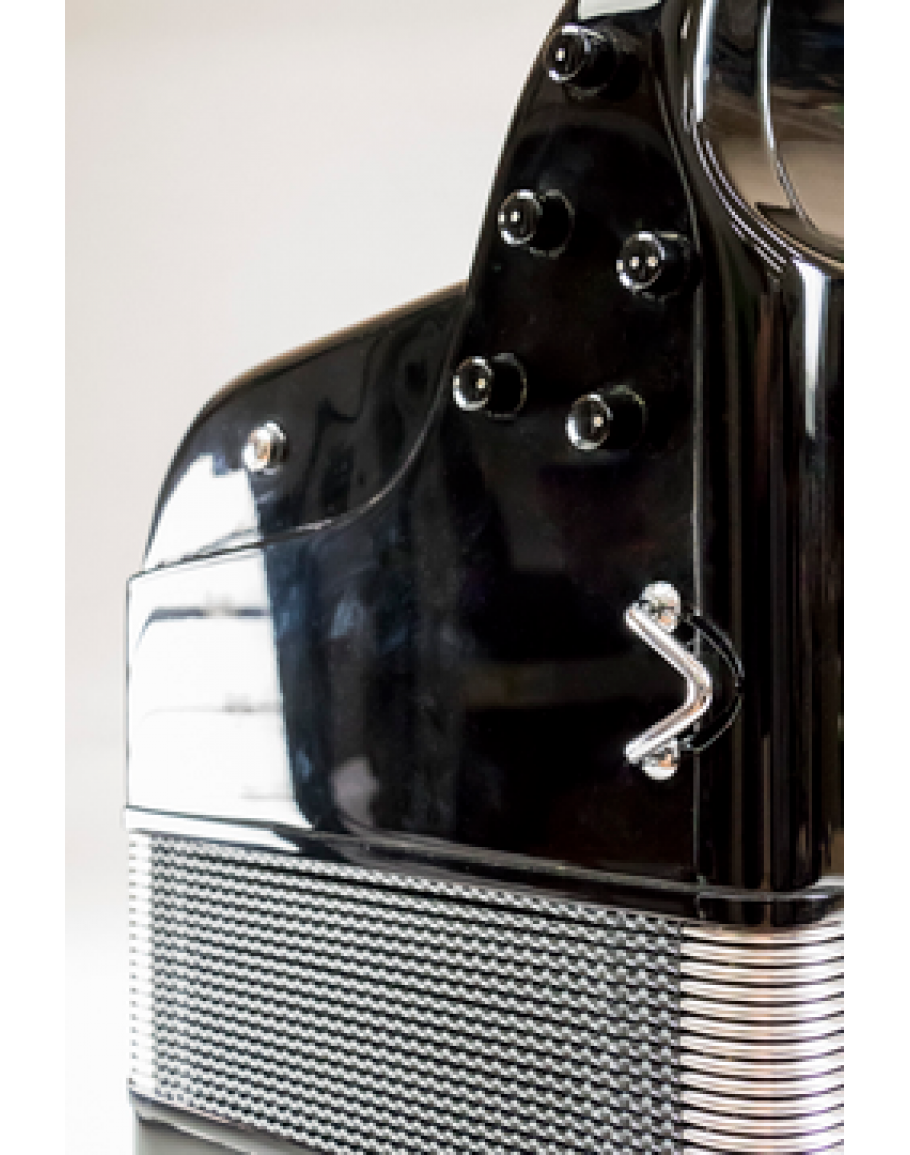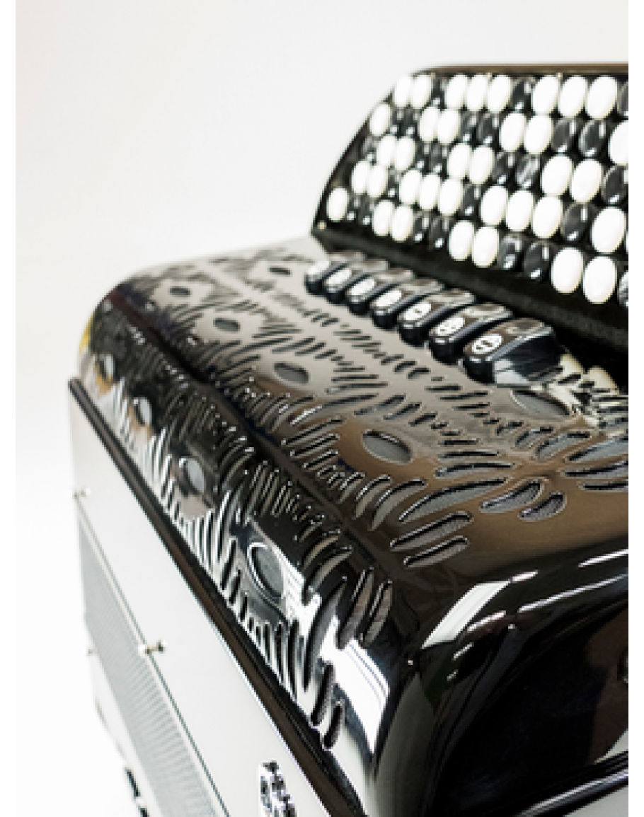-Mão direita: 86 botões, 5 filas, 52 notas (do#/mi), 3 vozes, 7 registos, 3 registos de queixo