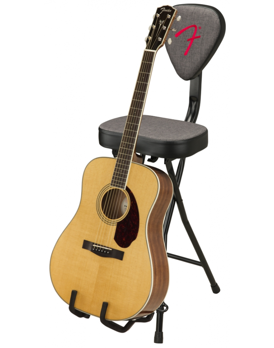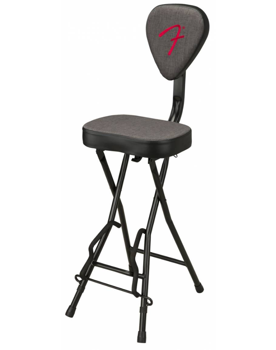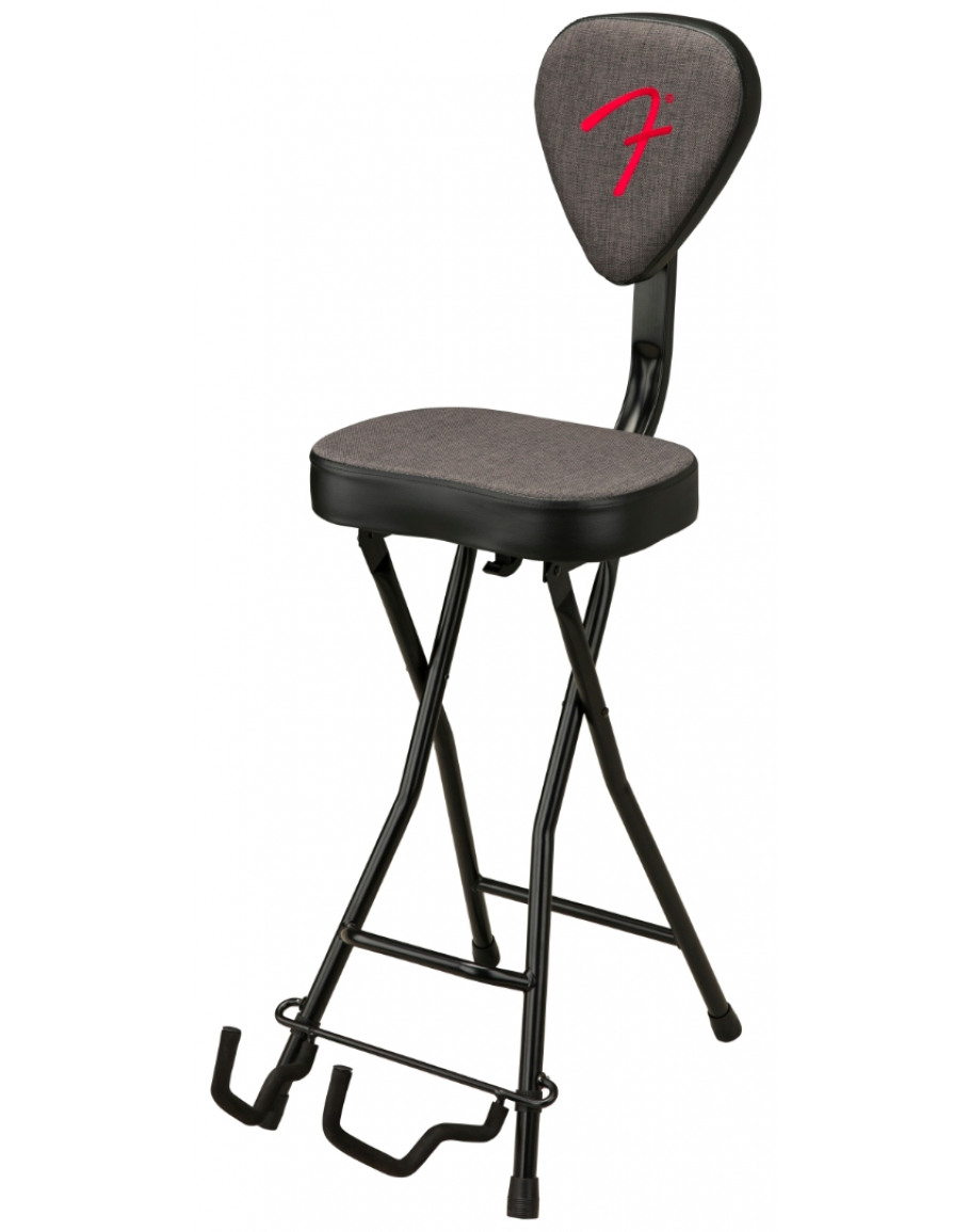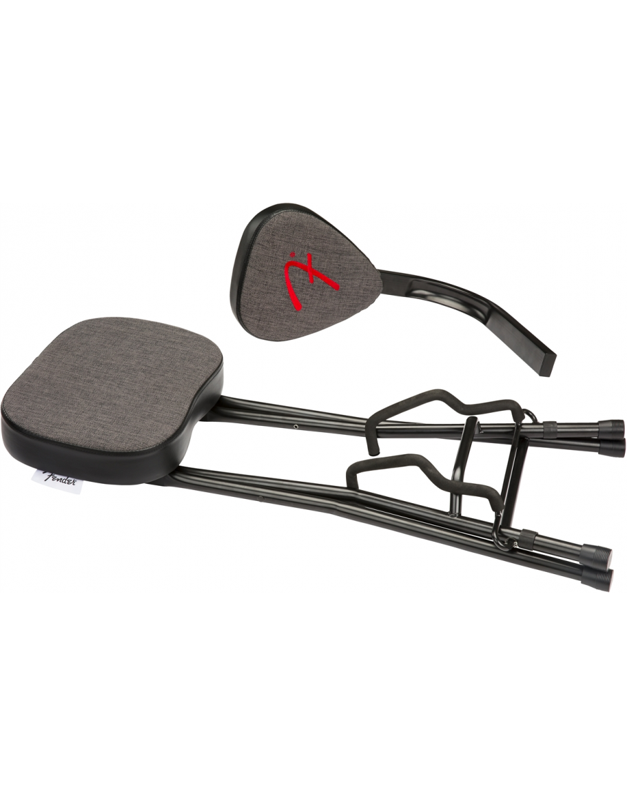 Ideal para qualquer guitarrista ou baixista, esta combinação de assento e suporte de guitarra facilita ter uma sessão de prática produtiva ou sobreviver a uma longa apresentação. Confortavelmente acolchoado para longas sessões de música, o assento e o encosto em forma de palheta do Fender 351 com o logotipo “F” bordado, são cobertos com tecido tweed cinza. O suporte de instrumento flip-up down - projetado para caber a maioria das guitarras e baixos - exibe o seu instrumento com segurança, enquanto o apoio para os pés da barra transversal integrado, acomoda praticamente qualquer posição das pernas. Projetado para fácil transporte, as pernas do assento dobram e o encosto é removível para torná-lo ainda mais compacto para transportar.