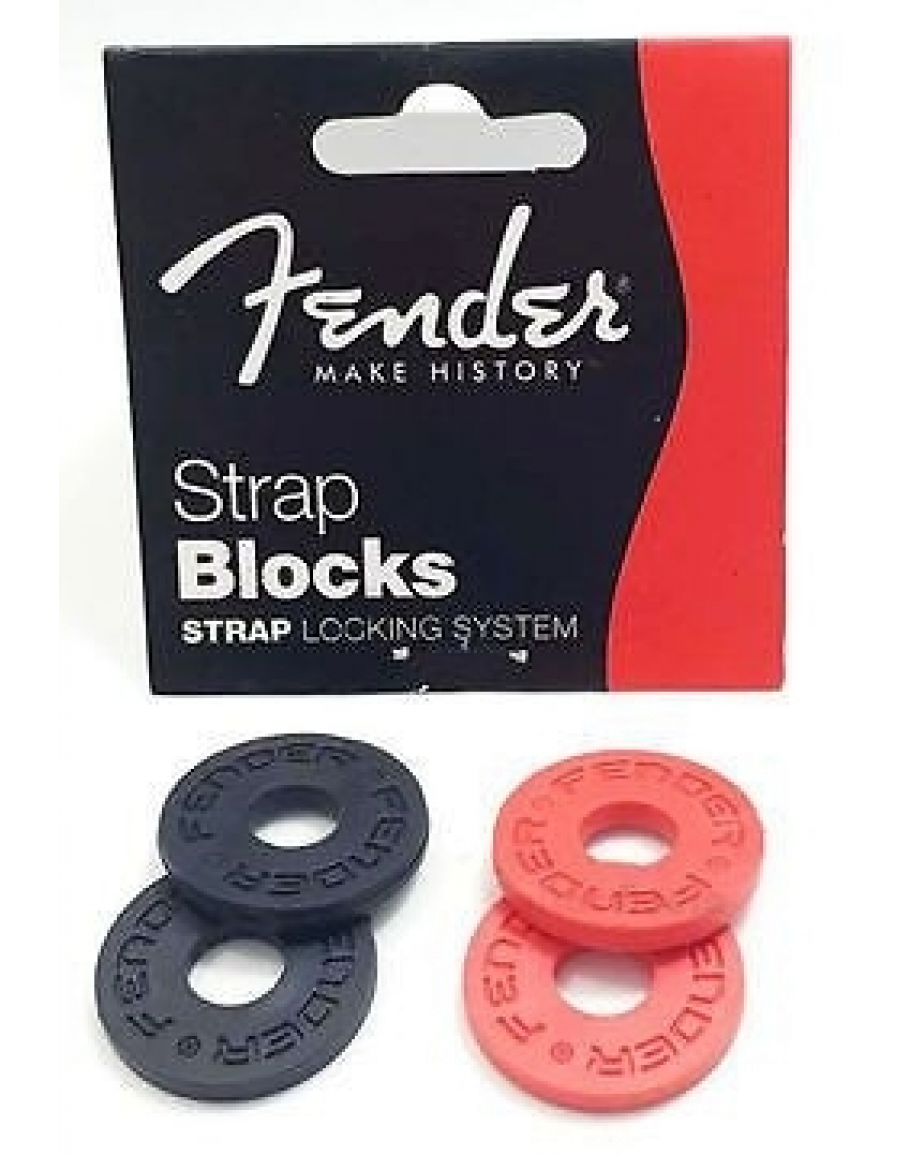 Conjunto de quatro bloqueadores de correia Fender Strap Blocks (dois pretos e dois vermelhos) que fornecem um meio extremamente simples e eficaz de bloquear a correia do seu instrumento no lugar. Compatível com a maioria das correias.