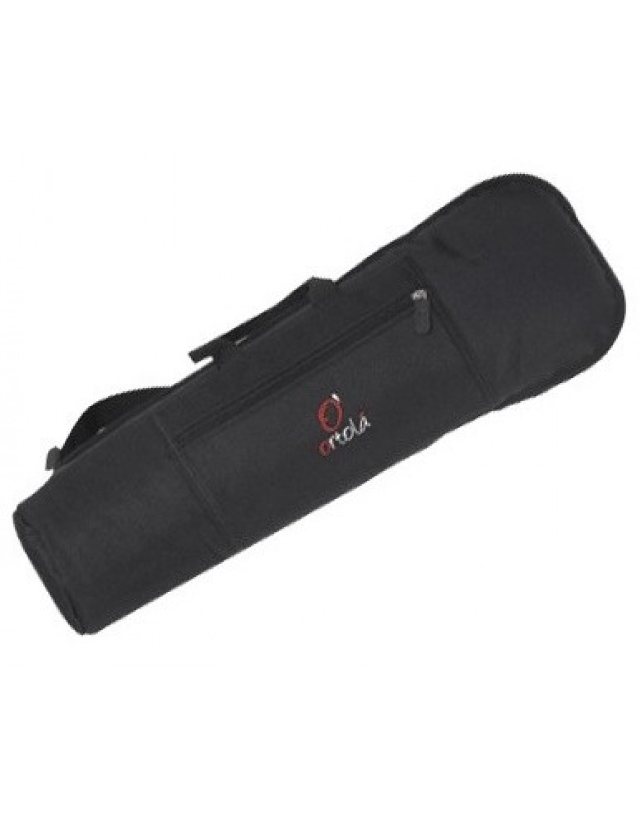 Saco em poliéster plastificado, acolchoado 25 mm, forro de veludo preto, mochila, bolso e duas alças. Medidas: 58x17x10 (campânula) cm.